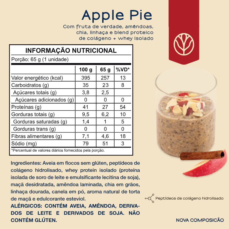 Inate Overnight Oats sabor Apple Pie: aveia sem glúten, peptídeos de colágeno hidrolisado, chia, linhaça, proteína isolada, amêndoas laminadas, maçã desidratada em cubos, pitada de canela em pó, e levemente adoçado com stévia. Ao abrir a embalagem, o irresistível aroma de uma autêntica torta de maçã irá envolver seus sentidos, e ao provar, descobrirá um sabor capaz de despertar suas memórias afetivas.