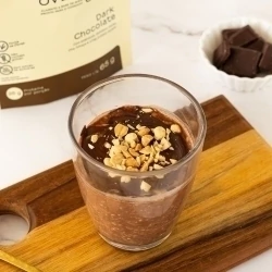 Inate Overnight Oats sabor Dark Chocolate: aveia sem glúten, chia, peptídeos de colágeno hidrolisado, proteína isolada, chia, linhaça, amêndoas laminadas, damasco em cubos, cacau e levemente adoçado com stévia. O cacau autêntico oferece um sabor marcante e os pedaços de damasco trazem textura e maciez a cada mordida. Impossível não se apaixonar!