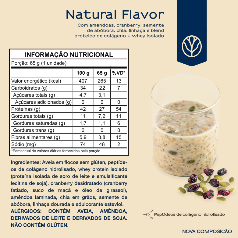 Inate Overnight Oats sabor Natural Flavor: aveia sem glúten, peptídeos de colágeno hidrolisado, proteína isolada, chia, linhaça, amêndoas laminadas, cranberry, semente de abóbora e levemente adoçado com stévia. Uma mistura ideal para quem busca um sabor mais suave e versatilidade para os preparos do seu dia-a-dia.