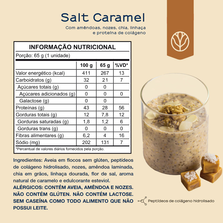 Inate Overnight Oats Salt Caramel: aveia sem glúten, peptídeos de colágeno hidrolisado, chia, linhaça, amêndoas laminadas, nozes, aroma natural de caramelo e levemente adoçado com stévia. Hummm imagina o cheirinho de caramelo com um toque flor de sal! Sabor que vai te conquistar e deixar sua alimentação saudável ainda mais saborosa!